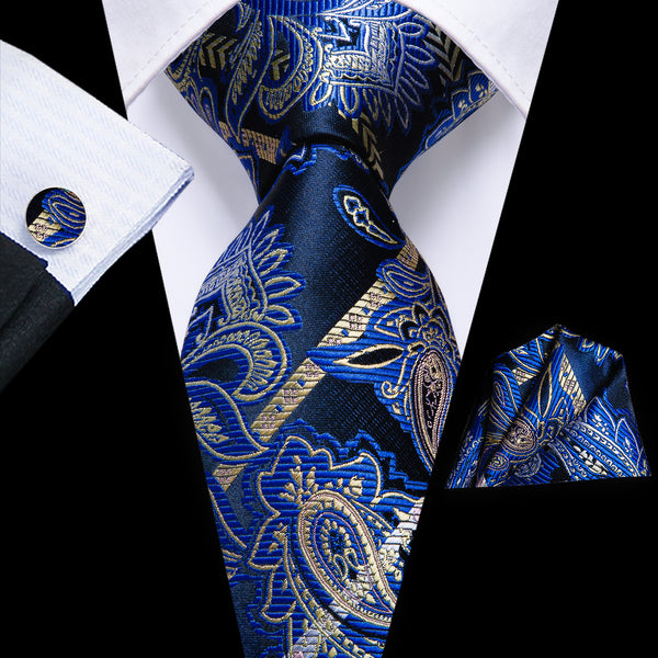 Deep Blue Golden Floral Silk Fabric Tie Hanky Cufflinks Set