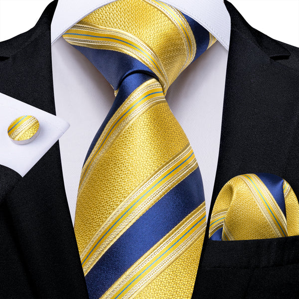 Dark Blue Yellow Striped Men's Necktie Pocket Square Cufflinks Set