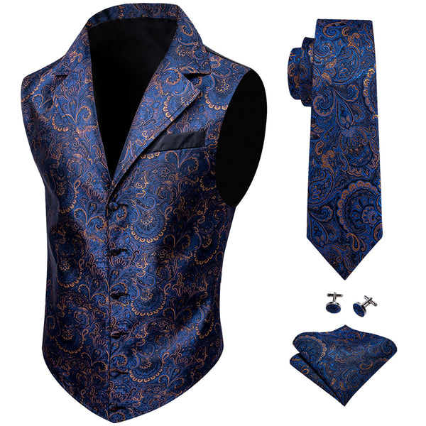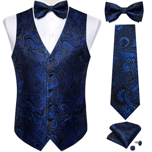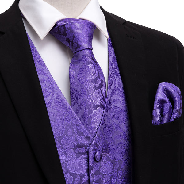 Purple Blue Paisley Jacquard Silk Men's Vest Hanky Cufflinks Tie Set