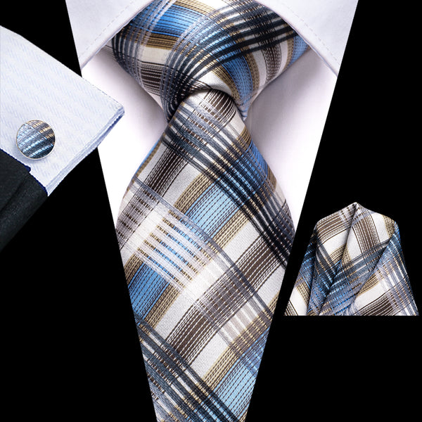 Khaki Blue Plaid Necktie Pocket Square Cufflinks Set