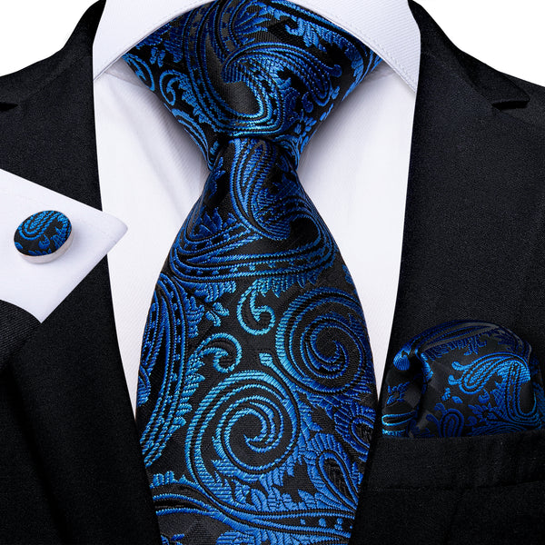 Deep Blue Paisley Men's Necktie Pocket Square Cufflinks Set with Lapel Pin