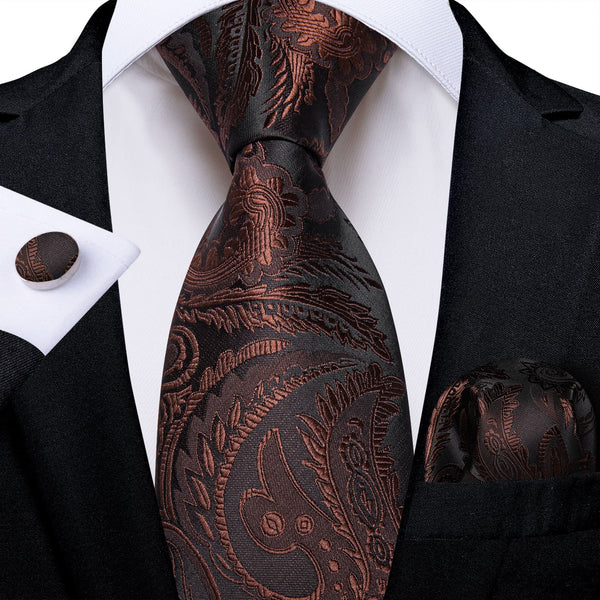 Ties2you Deep Brown Paisley Lazy Men's Easy-pull Silk Tie Pocket Square Cufflinks Set