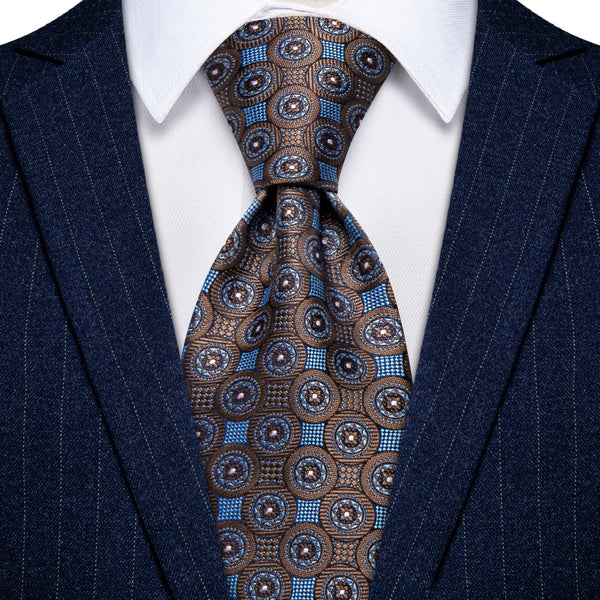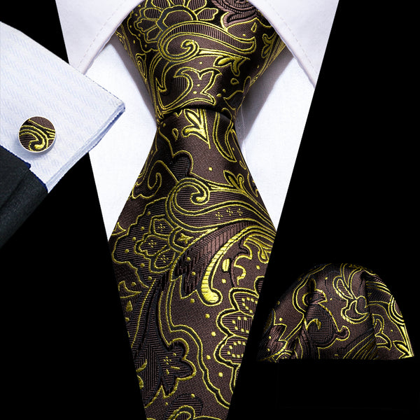 Ties2you Mens Tie Brown Gold Floral Mens Necktie Set Pocket Square Cufflinks Set