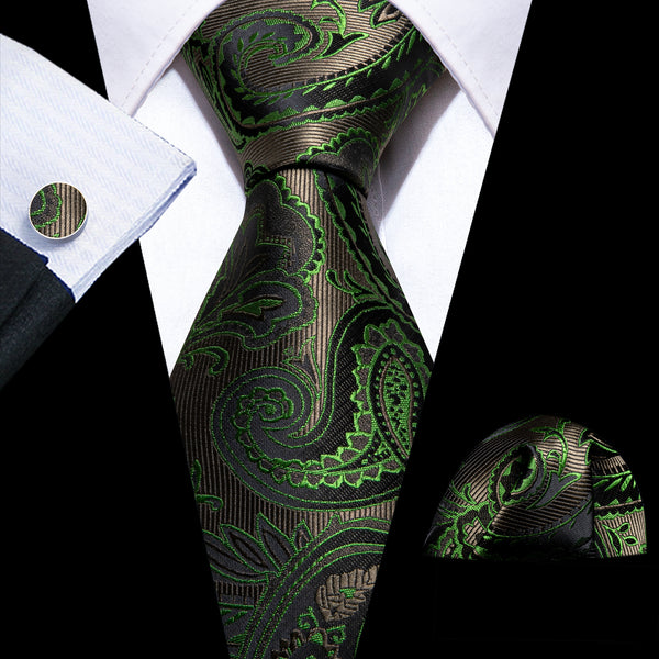 Green Brown Paisley Silk Pre-tied Tie Pocket Square Cufflinks Set