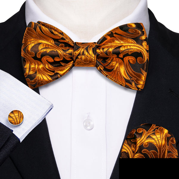 Black Golden Floral Silk Pre-tied Bow Tie Hanky Cufflinks Set