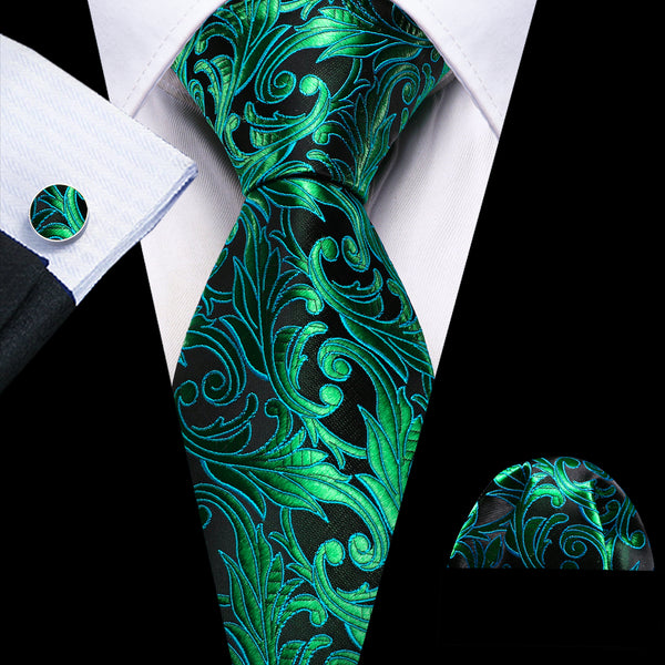 Black Pale Green Floral Men's Necktie Pocket Square Cufflinks Set