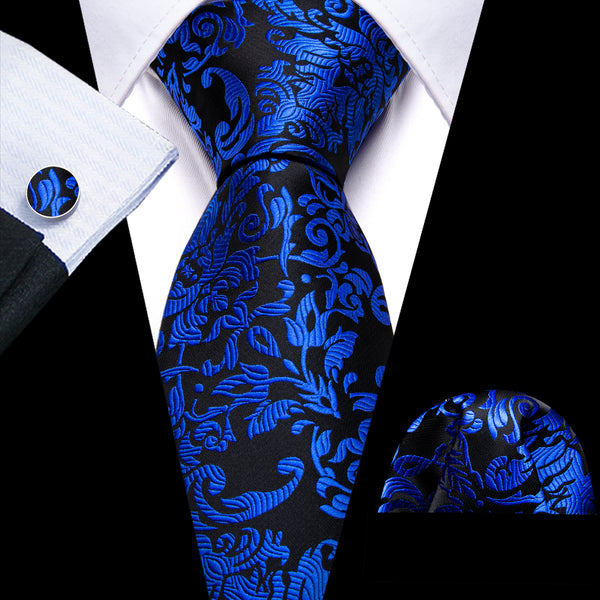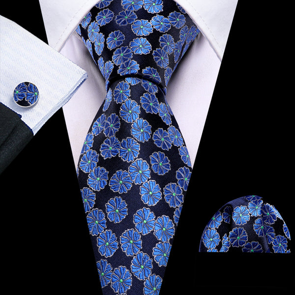Blue Black Floral Silk Tie Pocket Square Cufflinks Set