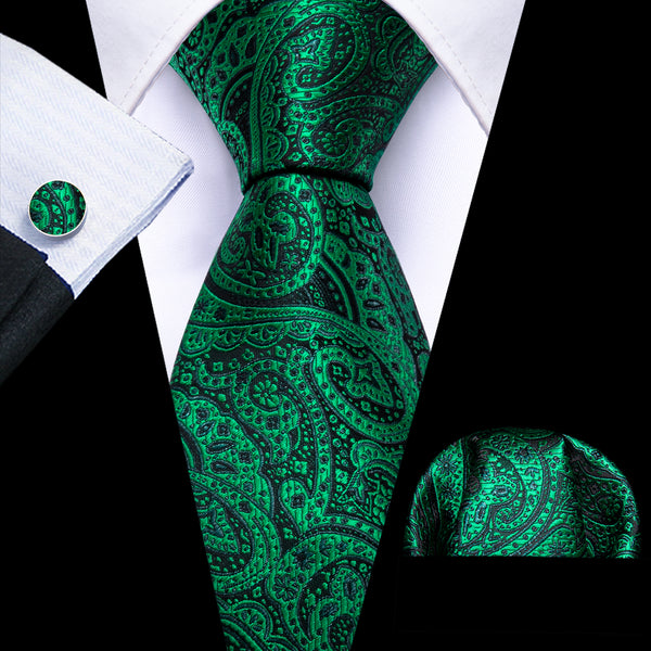 Black Teal Green Paisley Silk Tie Pocket Square Cufflinks Set