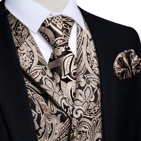 Ties2you Black Brown Floral Double Breasted Silk Mens Vest Hanky Cufflinks Tie Set