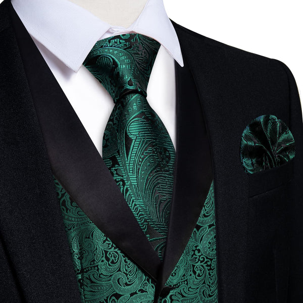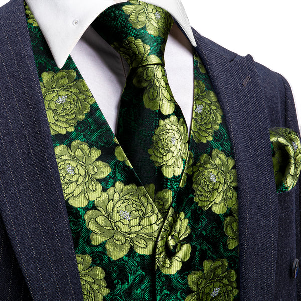Ties2you Mens Vest Top Dark Green Floral Silk Dress Vest Tie Handkerchief Cufflinks Set