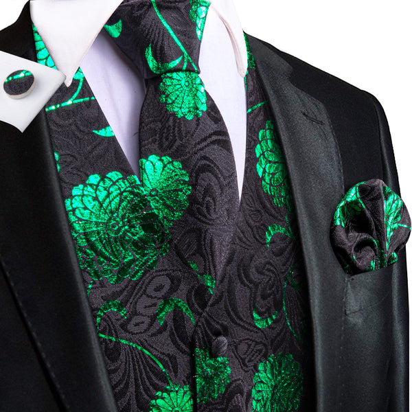 Green Black Floral Silk Men's Vest Bow Tie Handkerchief Cufflinks Set Waistcoat Suit Set