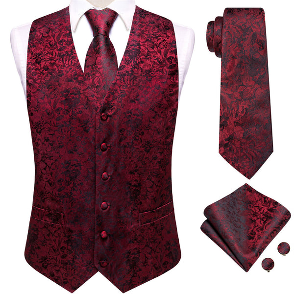 Ties2you Shawl Collar Vest Maroon Floral Wedding Dress Vest Tie Pocket Square Cufflinks Set