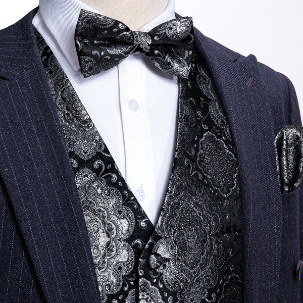Ties2you Black Floral Silk Men Vest Necktie Hanky Cufflinks Set