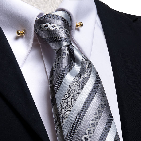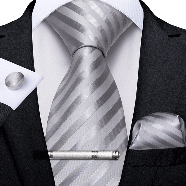 Silver Grey Novelty Striped Silk Men's Tie Pocket Square Cufflinks Set