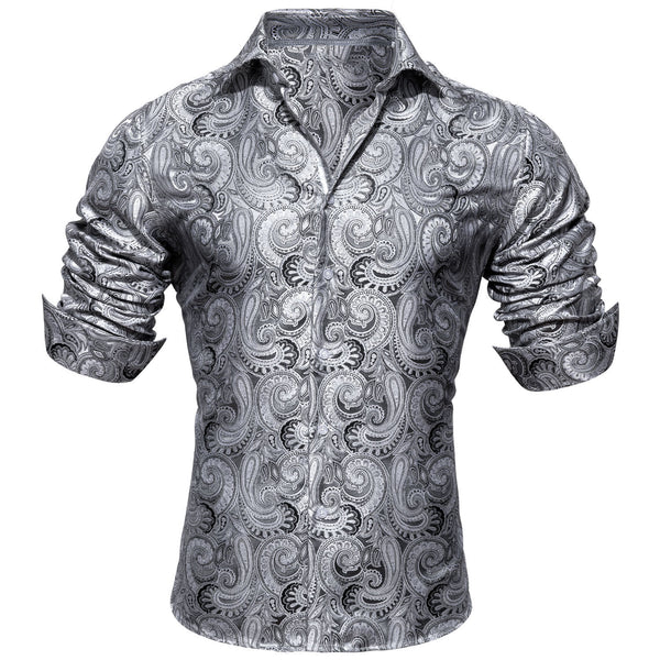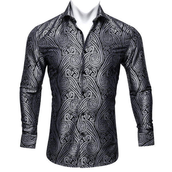 Ties2you Silver Paisley Dress Shirt Mens Silk Black Long Sleeve Button Down Shirt