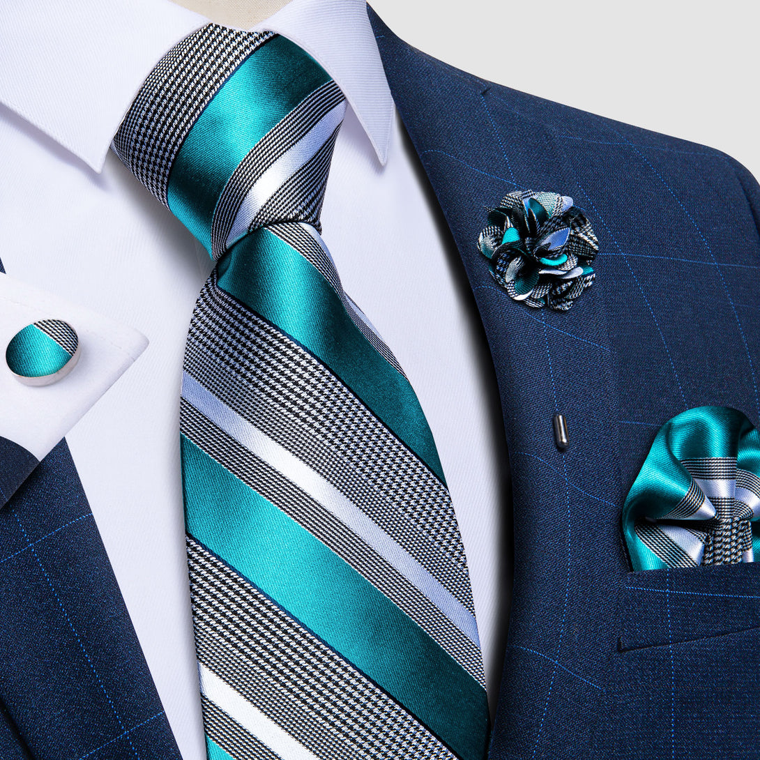 Grey Striped Men's Necktie Pocket Square Cufflinks Set with Lapel Pin