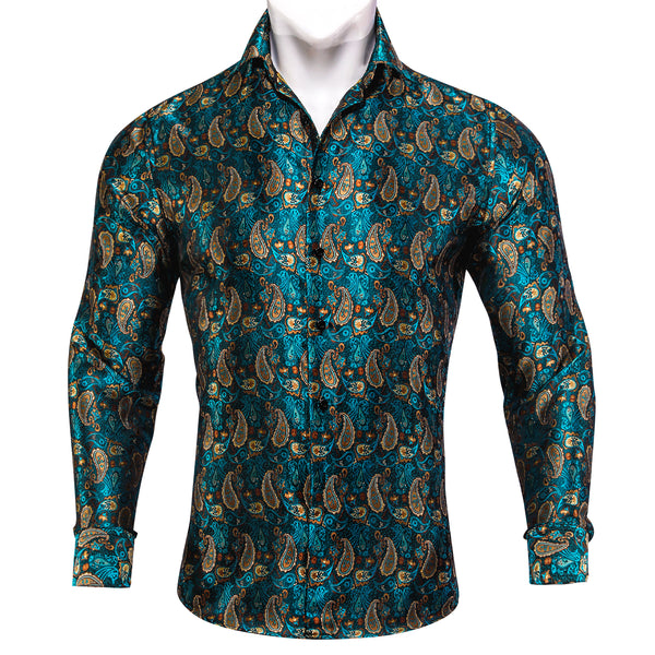 Green Orange Gradient Luxury Paisley Pattern Silk Men's Long Sleeve Shirt