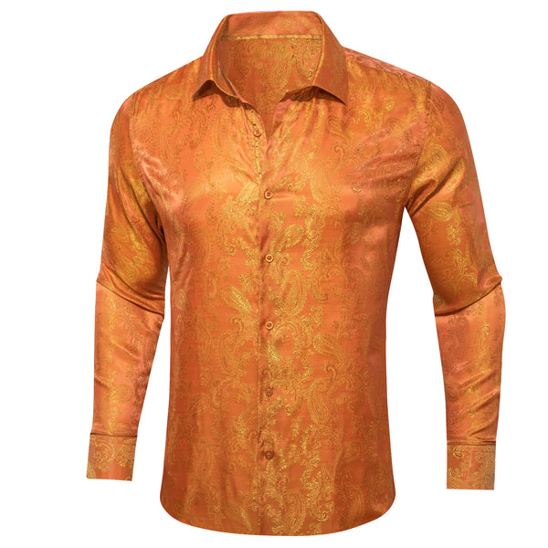 Ties2you Dress Shirt Flame Orange Paisley Long Sleeve Mens Silk Button Up Shirt
