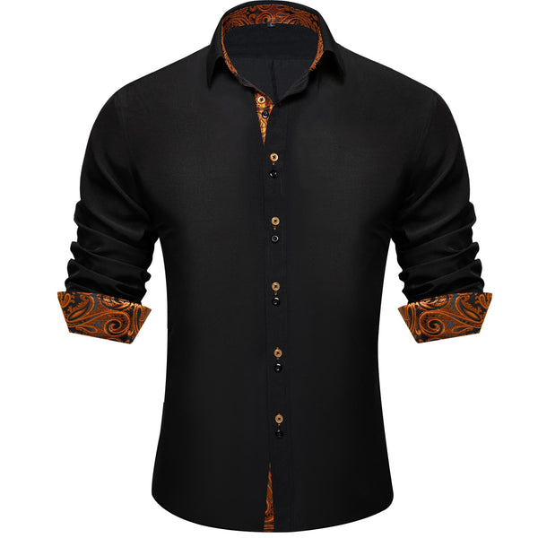 Ties2you Dress Shirt for Men Black Solid Orange Splicing Silk Long Sleeve Shirt