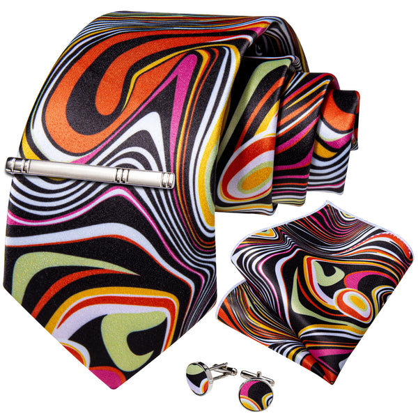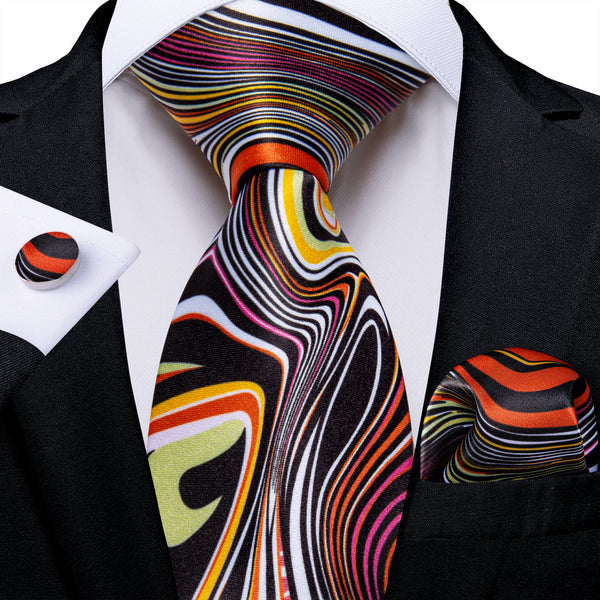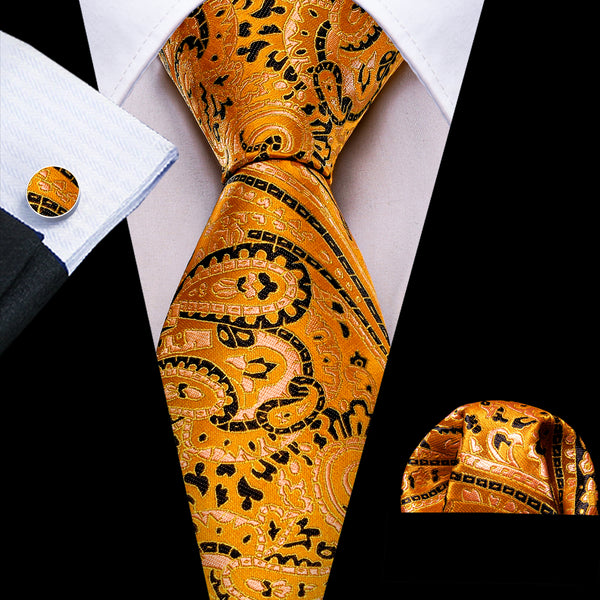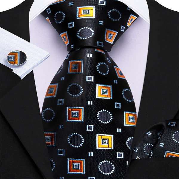 Black Orange Striped Men's Necktie Pocket Square Cufflinks Set