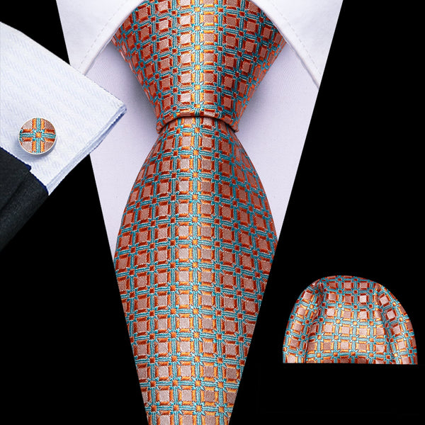 Ties2you Burnt Orange Grey Plaid Silk Tie Hanky Cufflinks Set