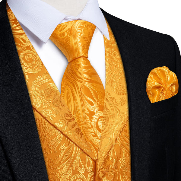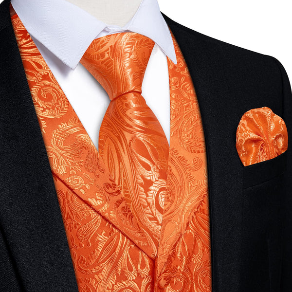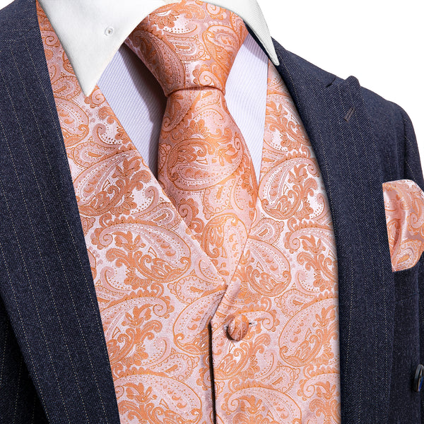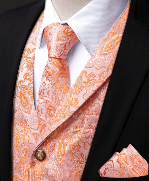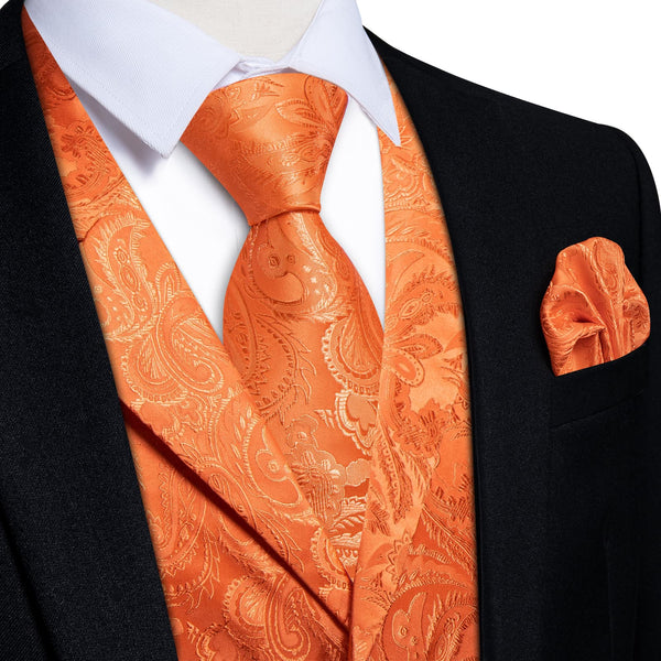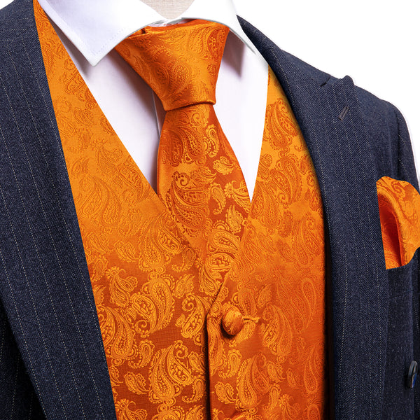 Orange Paisley Metal Button Jacquard Silk Men's Vest Hanky Cufflinks Tie Set