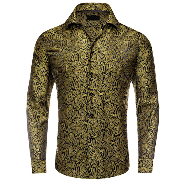 Ties2you Dress Shirt Gold Paisley Button Up Silk Long Sleeve Men's Shirt
