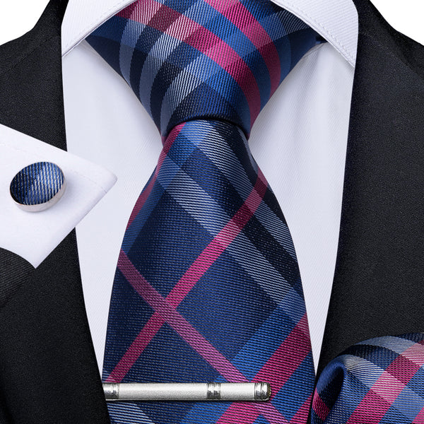 Ties2you Rose Pink Blue Plaid Tie Handkerchief Cufflinks Set