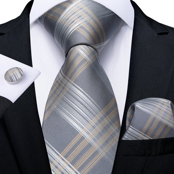 Grey Black Plaid Tie Pocket Square Cufflinks Set