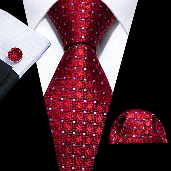 Burgundy Red Plaid Men's Necktie Pocket Square Cufflinks Set
