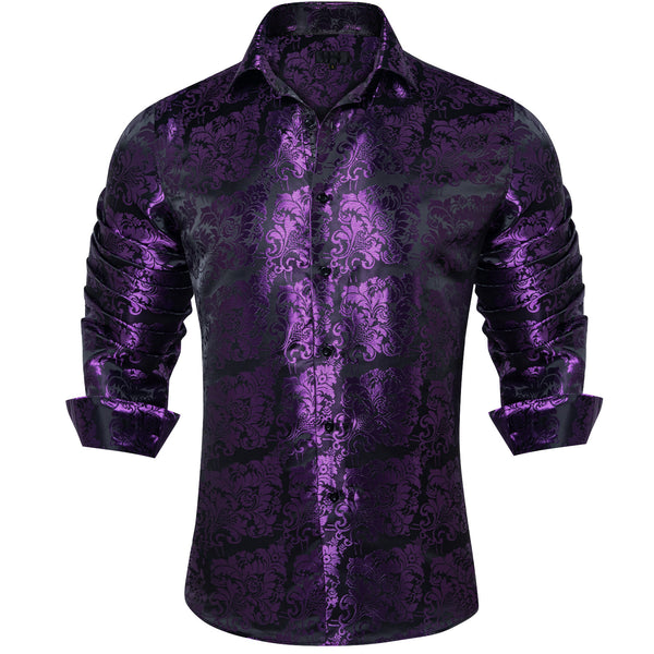 Black Purple Floral Silk Men's Long Sleeve Shirt