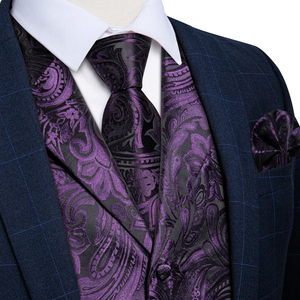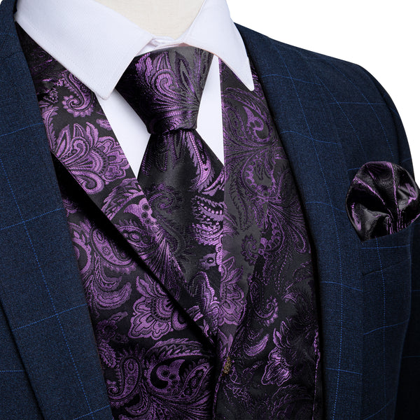 Black Purple Paisley Jacquard Silk Men's Vest Hanky Cufflinks Tie Set
