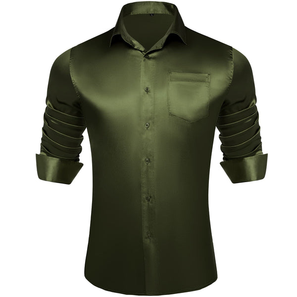 Suit Shirt Olive Drab Green Solid Satin Mens Silk Long Sleeve Shirt