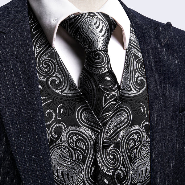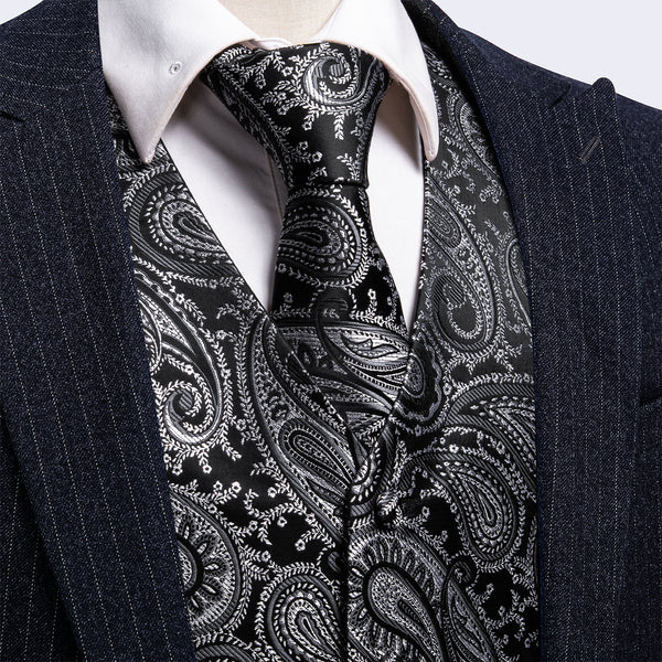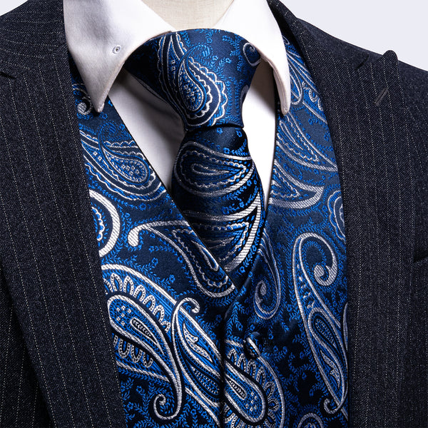 Baby Blue Paisley Jacquard Silk Men's Vest Hanky Cufflinks Tie Set