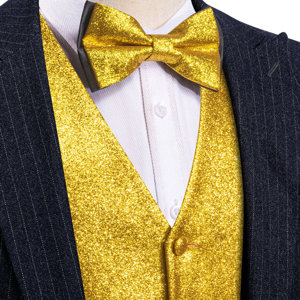 Shining Black Glitter Solid Jacquard Silk Men's Vest Bow Tie Handkerchief Cufflinks Set Waistcoat Suit Set