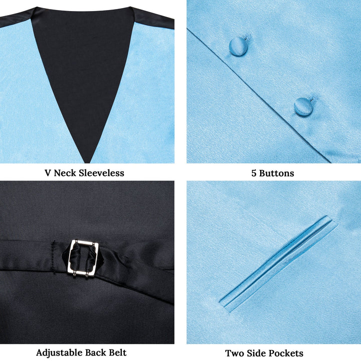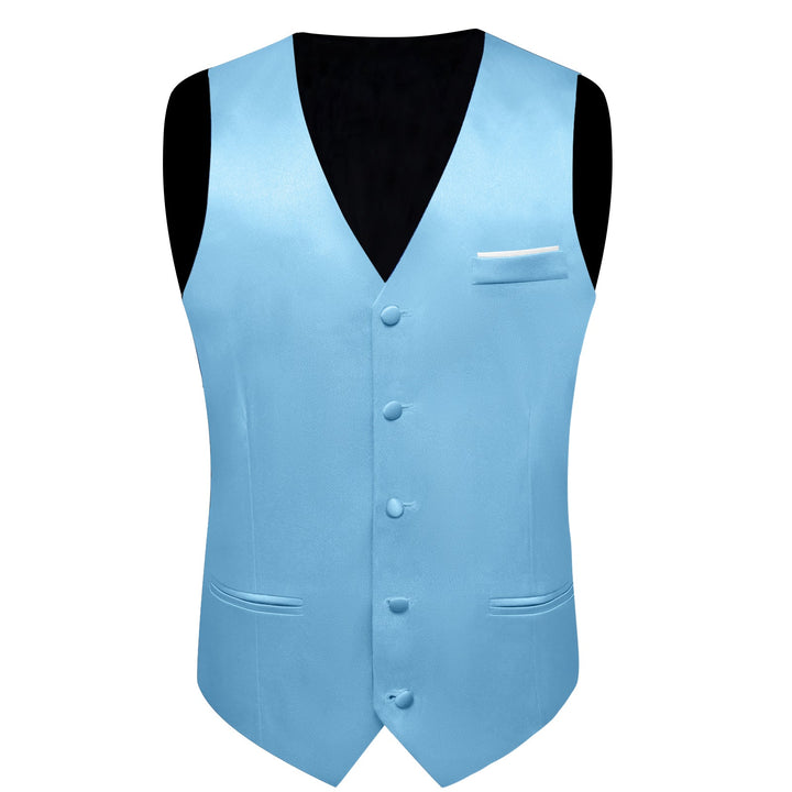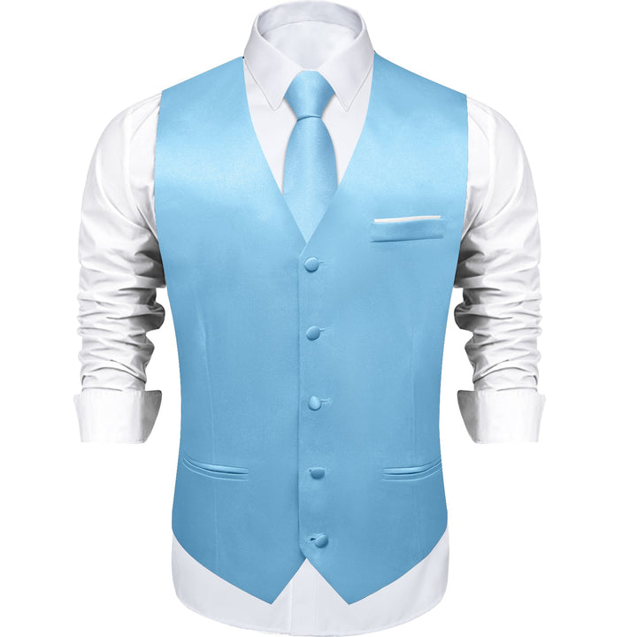 Baby Blue Solid Shining Silk Formal Men's Vest Hanky Cufflinks Tie Set