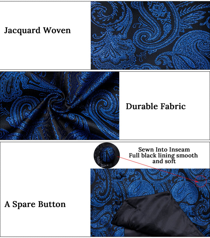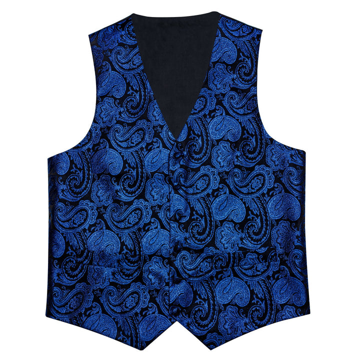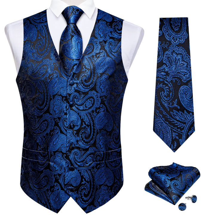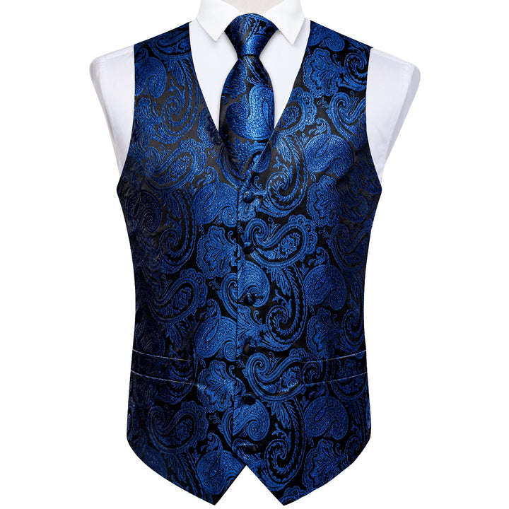 Black Blue Paisley Jacquard Silk Men's Vest Hanky Cufflinks Tie Set