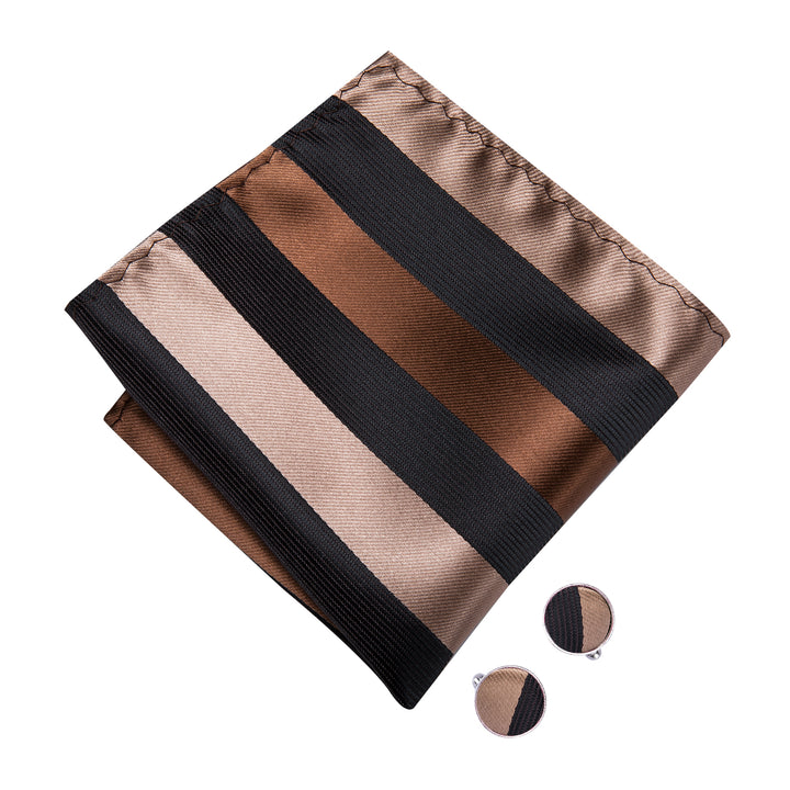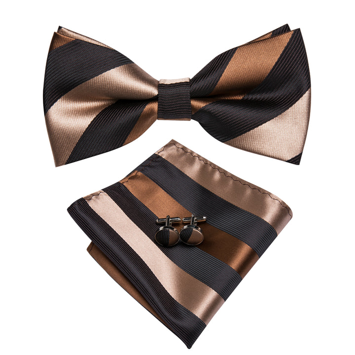 Black Brown Striped Men's Pre-tied Bowtie Pocket Square Cufflinks Set