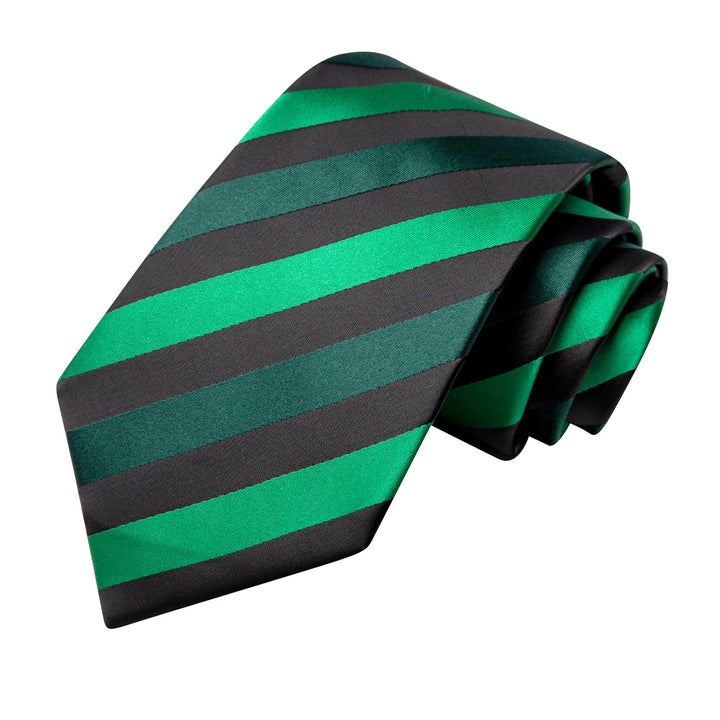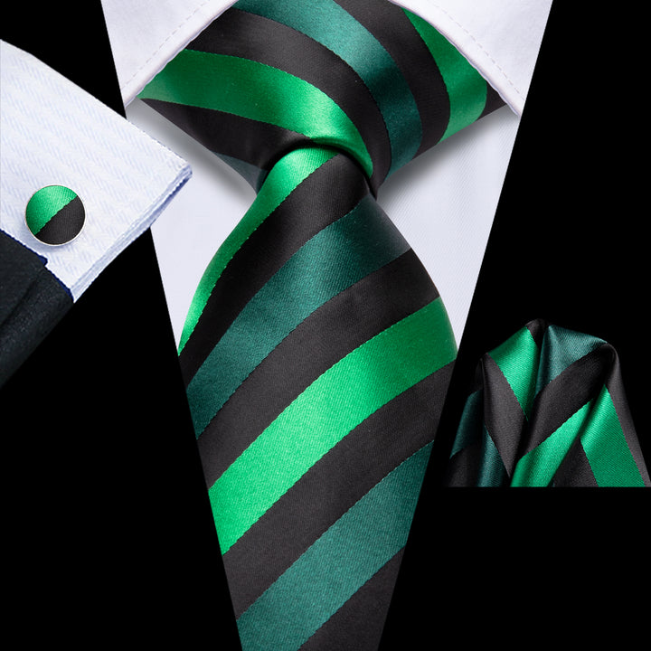 Black Green Striped Men's Necktie Hanky Cufflinks Set