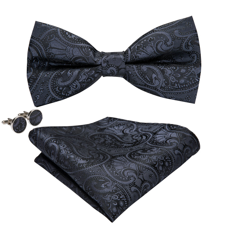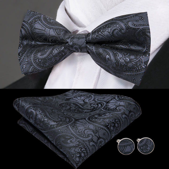 Black Grey Paisley Pre-tied Bow Tie Hanky Cufflinks Set