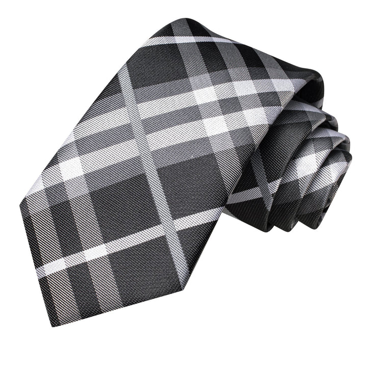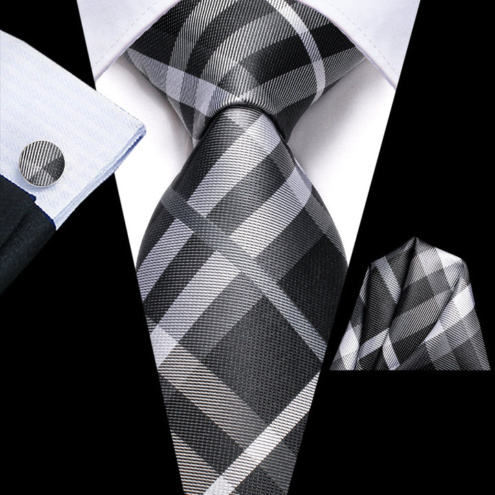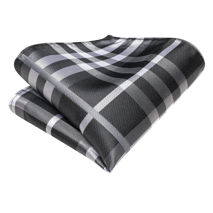 Black Grey White Plaid Men's 70 Inches Extra Length Tie Handkerchief Cufflinks Set