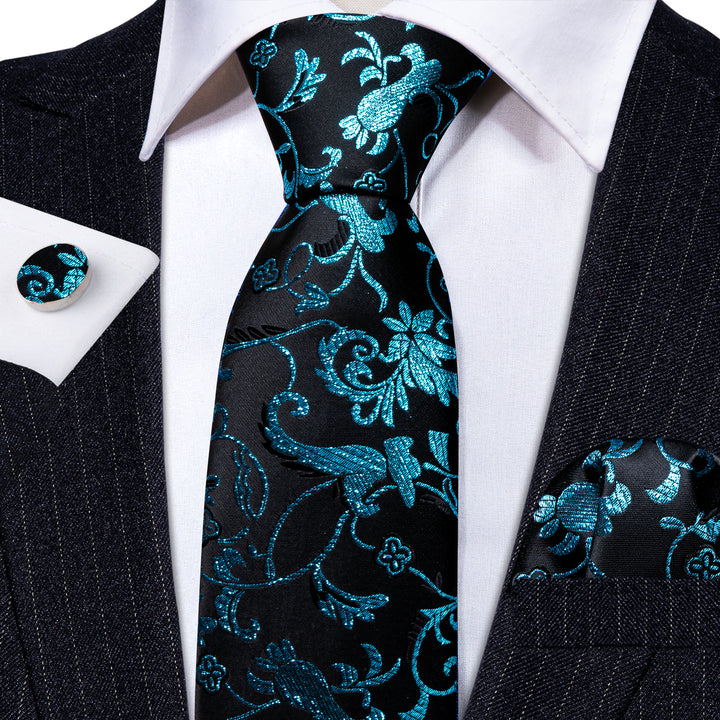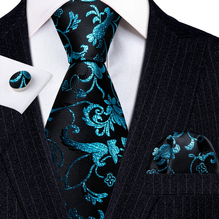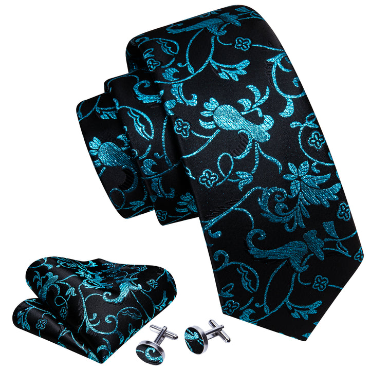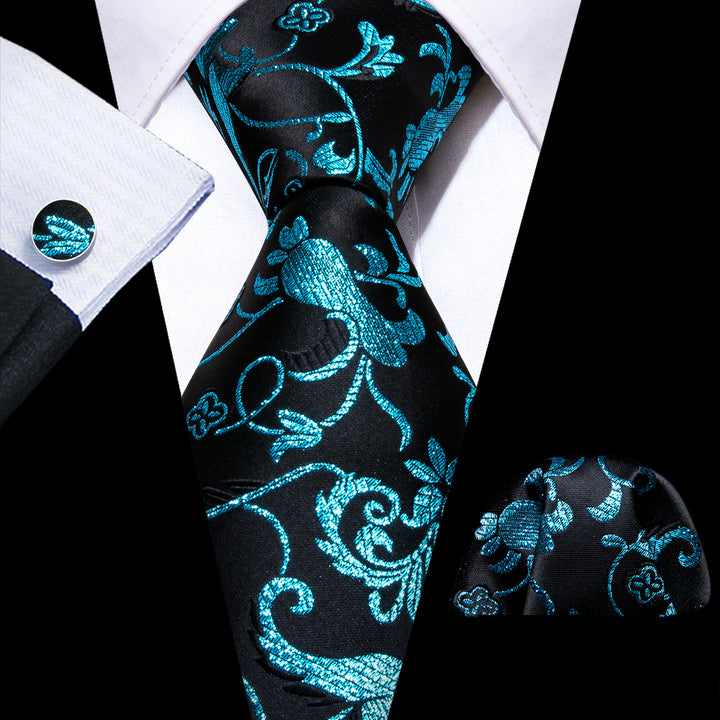 Black Lake Blue Floral Men's Necktie Hanky Cufflinks Set
