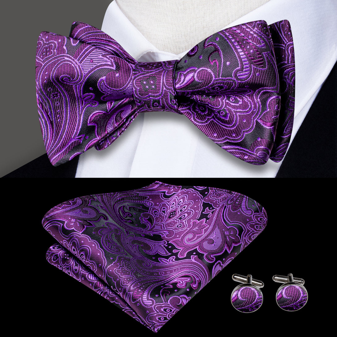 Black Purple Paisley Self-tied Bow Tie Pocket Square Cufflinks Set