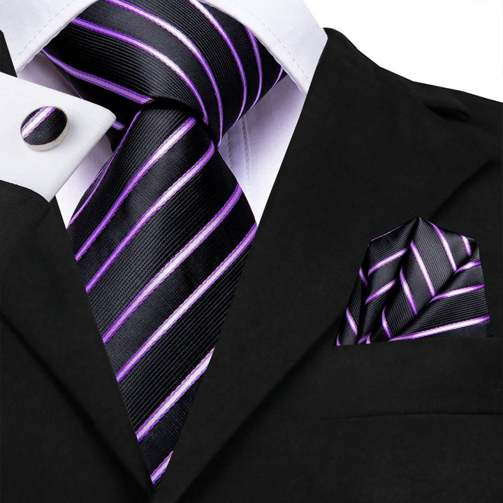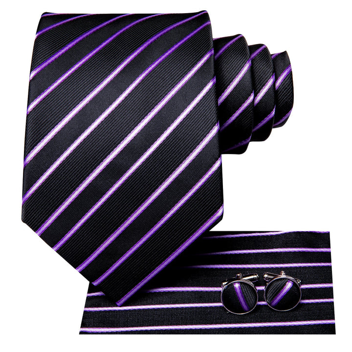Black Purple Striped Men's 70 Inches Extra Length Tie Handkerchief Cufflinks Set