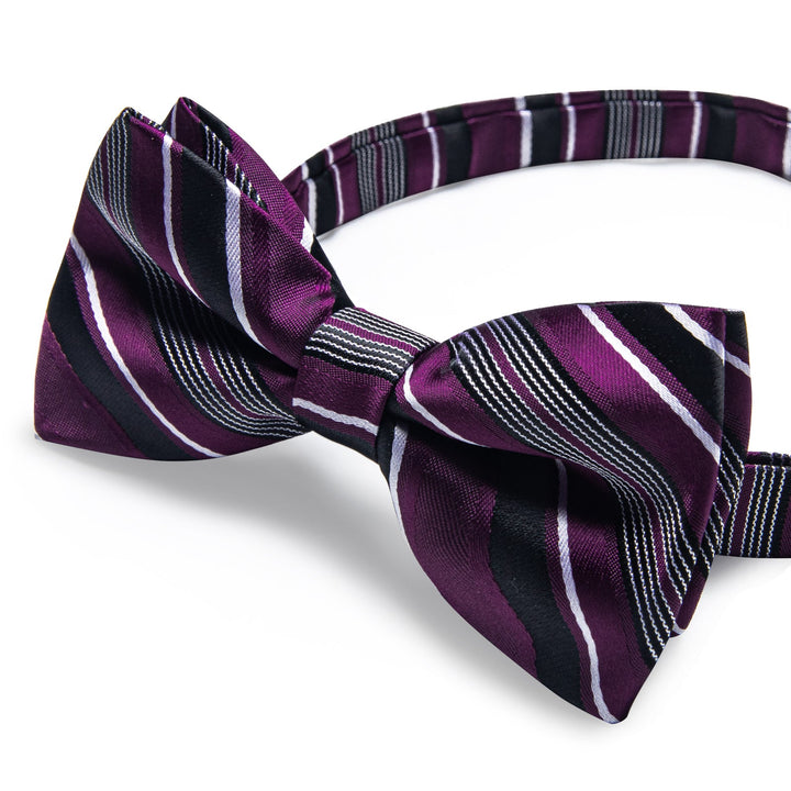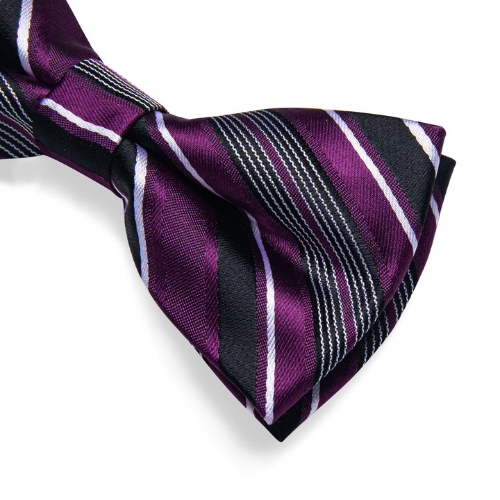 Black Purple Striped Men's Pre-tied Bowtie Pocket Square Cufflinks Set with Lapel Pin