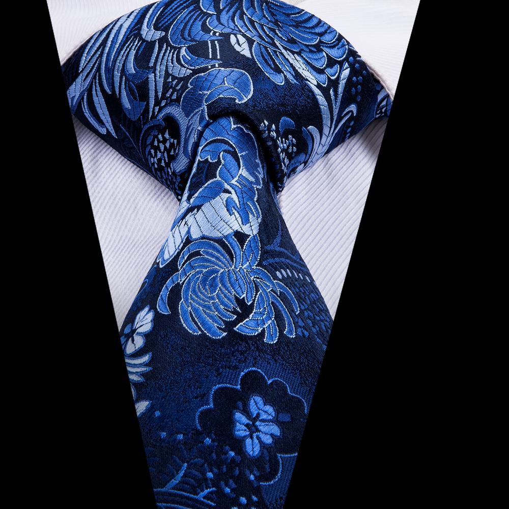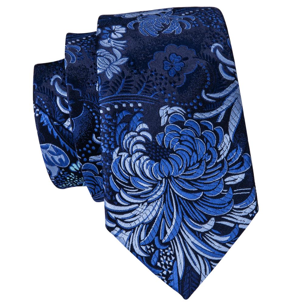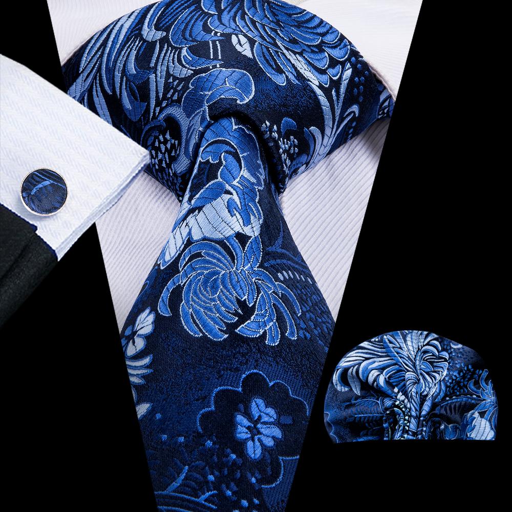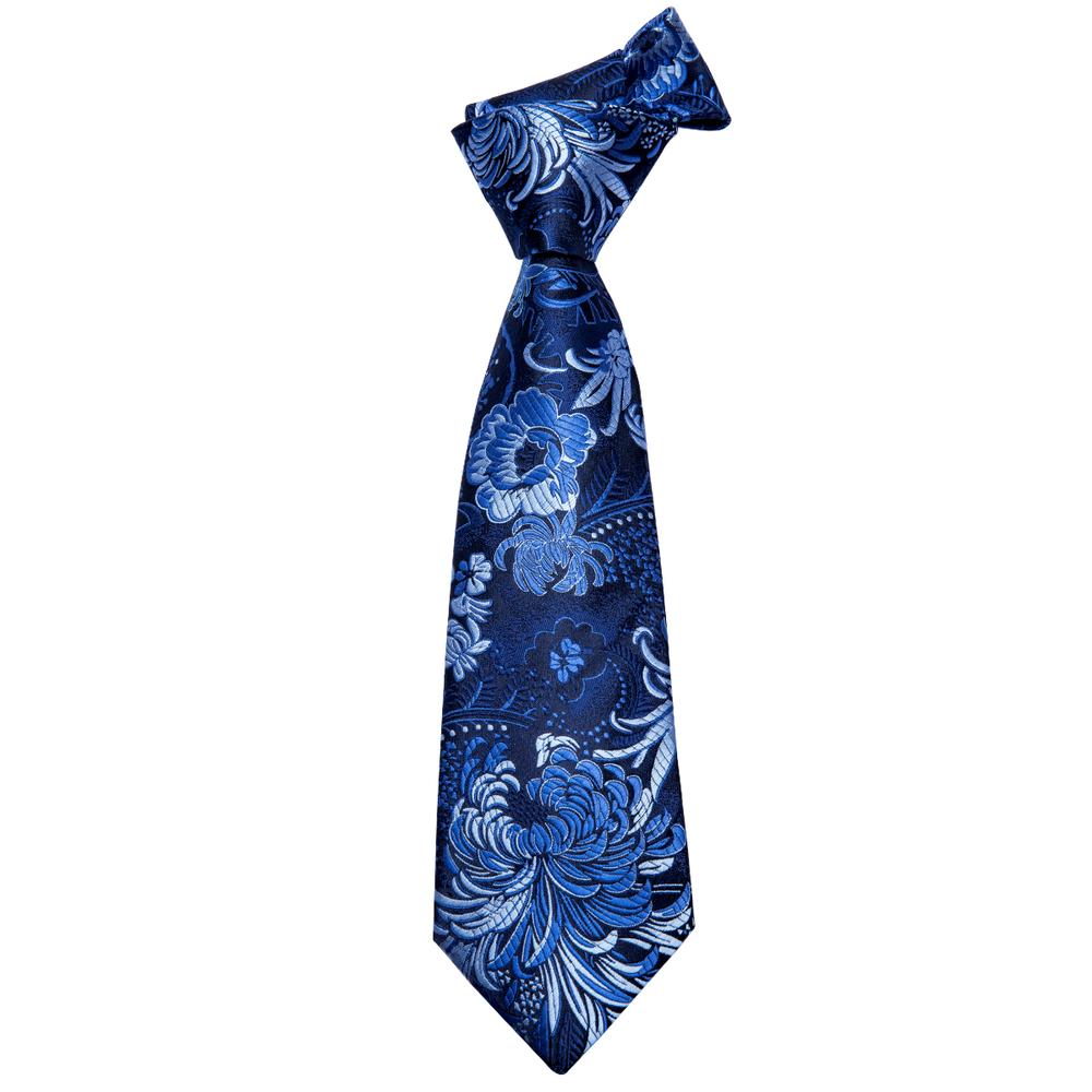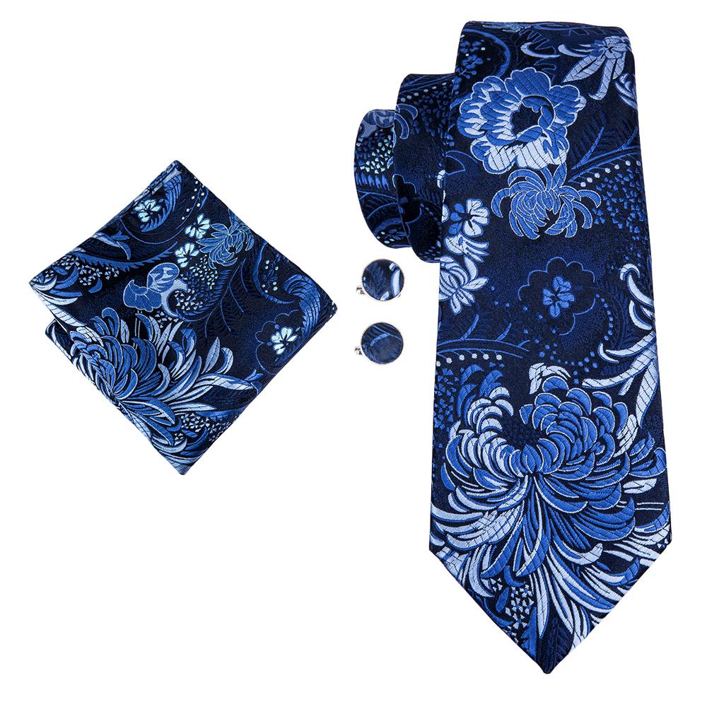 Blue Floral Men's Necktie Handkerchief Cufflinks Set