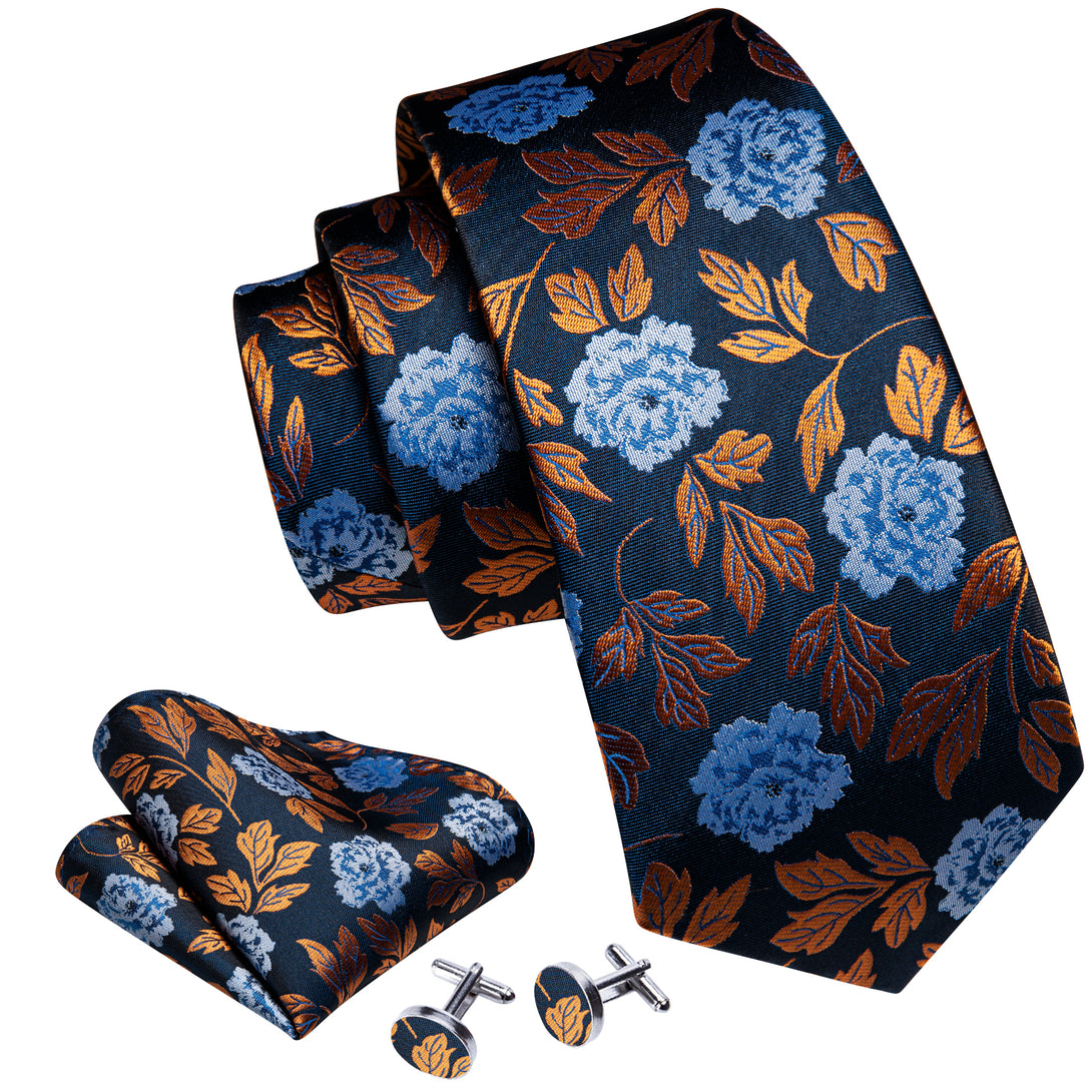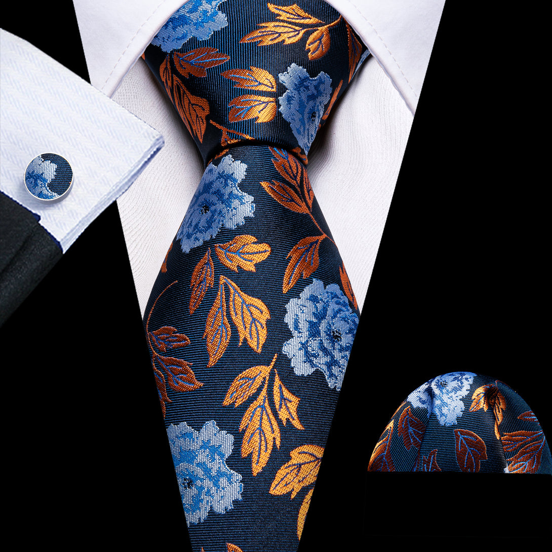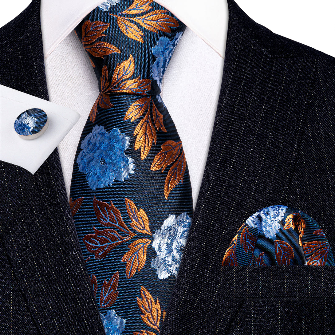 Blue Golden Leaves Paisley Silk Tie Pocket Square Cufflinks Set
