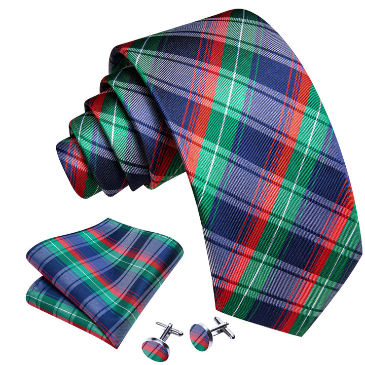 Blue Red Green Plaid Men's Necktie Pocket Square Cufflinks Set