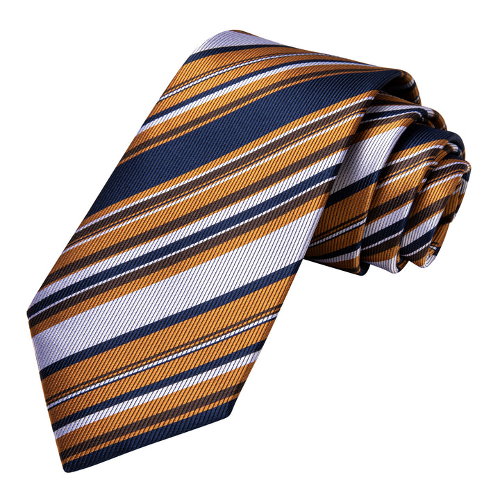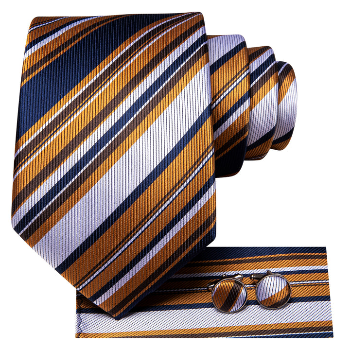 Blue White Golden Striped Tie Handkerchief Cufflinks Set