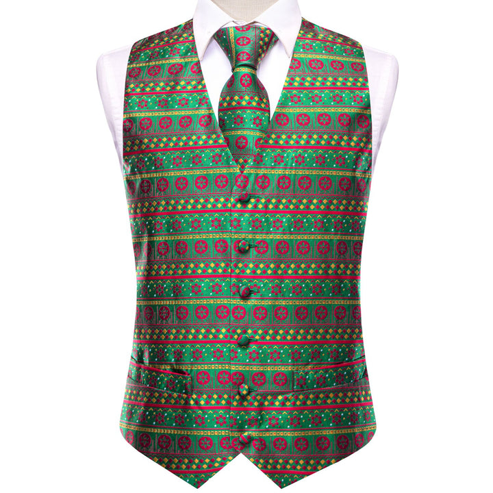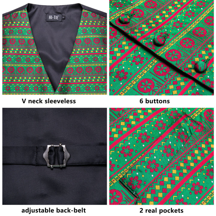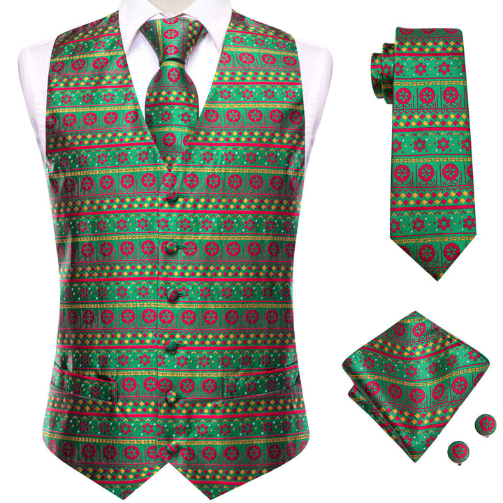 Blue Yellow Christmas Red Flower Novelty Jacquard Silk Men's Vest Hanky Cufflinks Tie Set